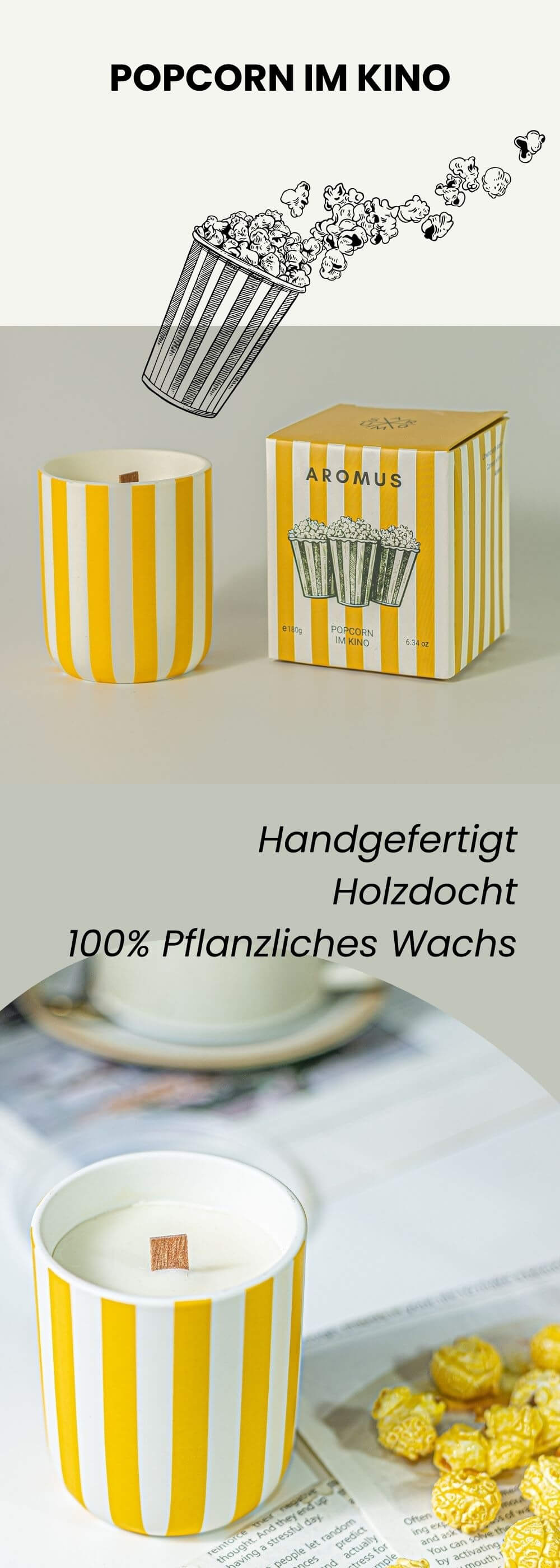 Lust auf einen Kinobesuch, aber die Couch ruft? Keine Sorge! Mit unserer Duftkerze mit Holydocht „Popcorn im Kino“ bringen Sie das Kino-Feeling direkt zu Ihnen nach Hause – ohne das lästige Parken oder die lange Schlange am Snackstand!