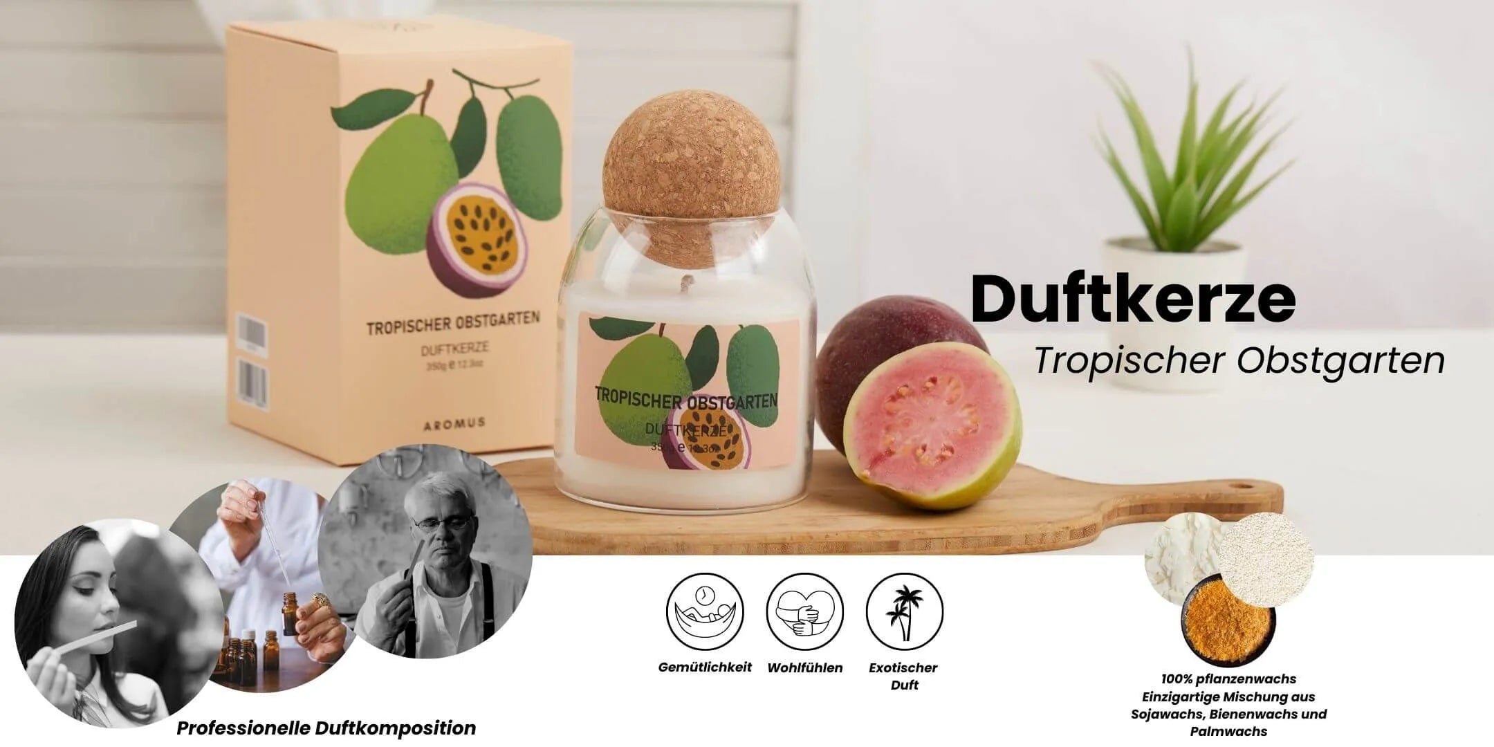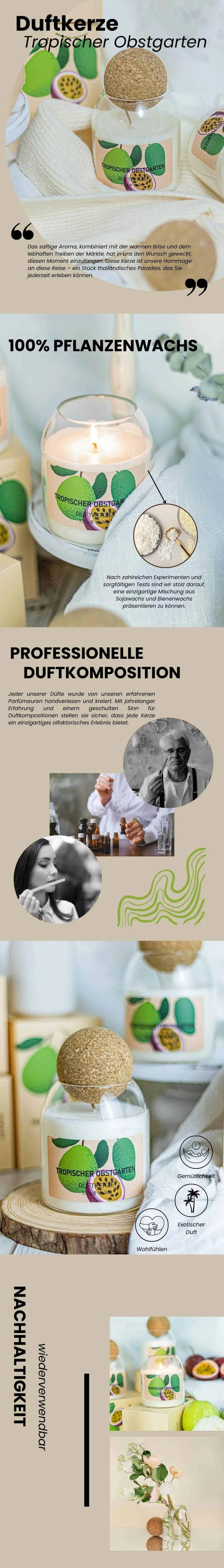 Lassen Sie sich von der üppigen Süße der Guave verführen, spüren Sie die spritzige Frische der Maracuja und lassen Sie sich von dem erfrischenden Aroma der grünen Mango beleben. Jede Kerze ist handgefertigt, um eine harmonische Duftsymphonie zu schaffen, die Ihr Zuhause in eine tropische Oase verwandelt.