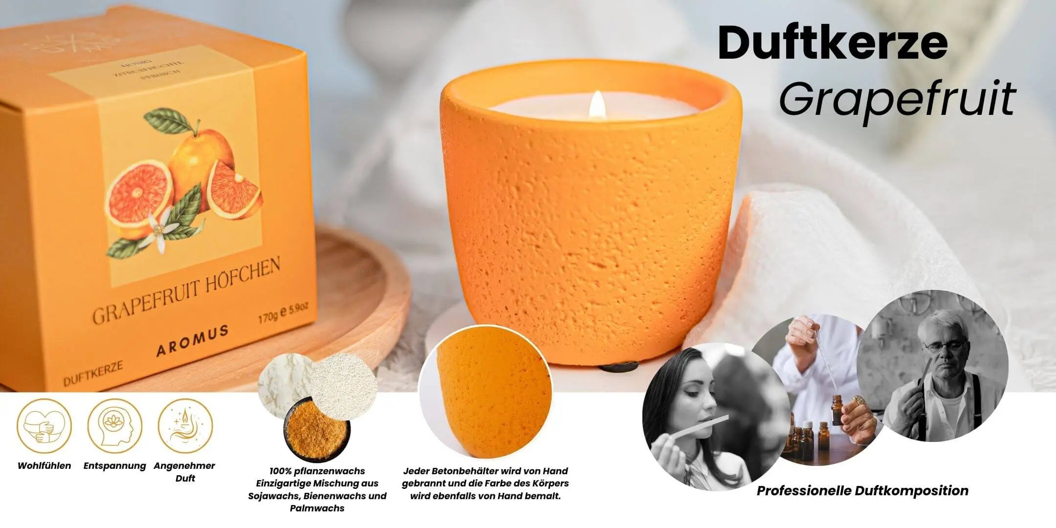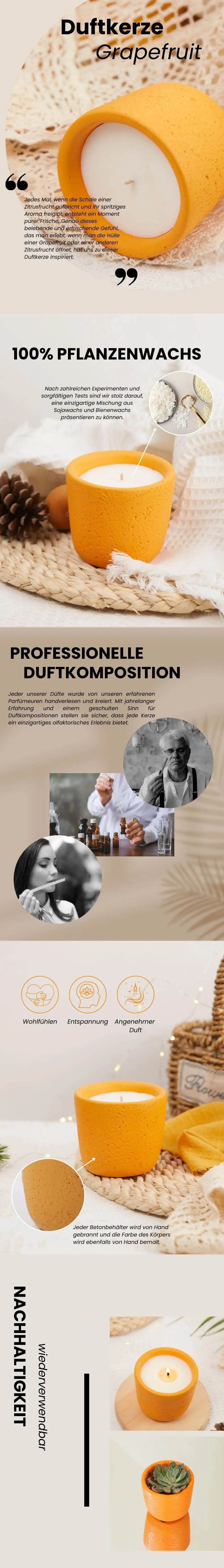 Perfekt für diejenigen, die sich nach einem Hauch von Sommer sehnen oder einfach ihre Umgebung mit einem frischen und zugleich gemütlichen Duft erfüllen möchten. Lassen Sie sich von unserer Grapefruit-Essenz Kerze in eine Welt voller Sinnlichkeit und Frische entführen.