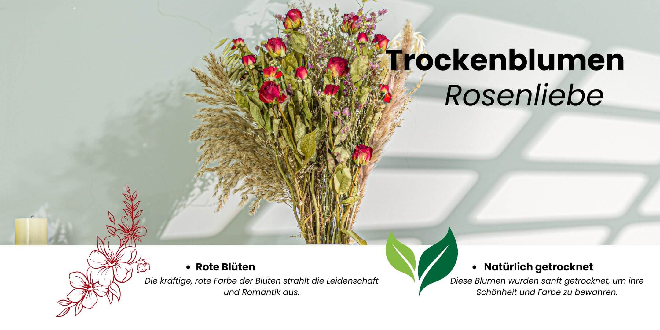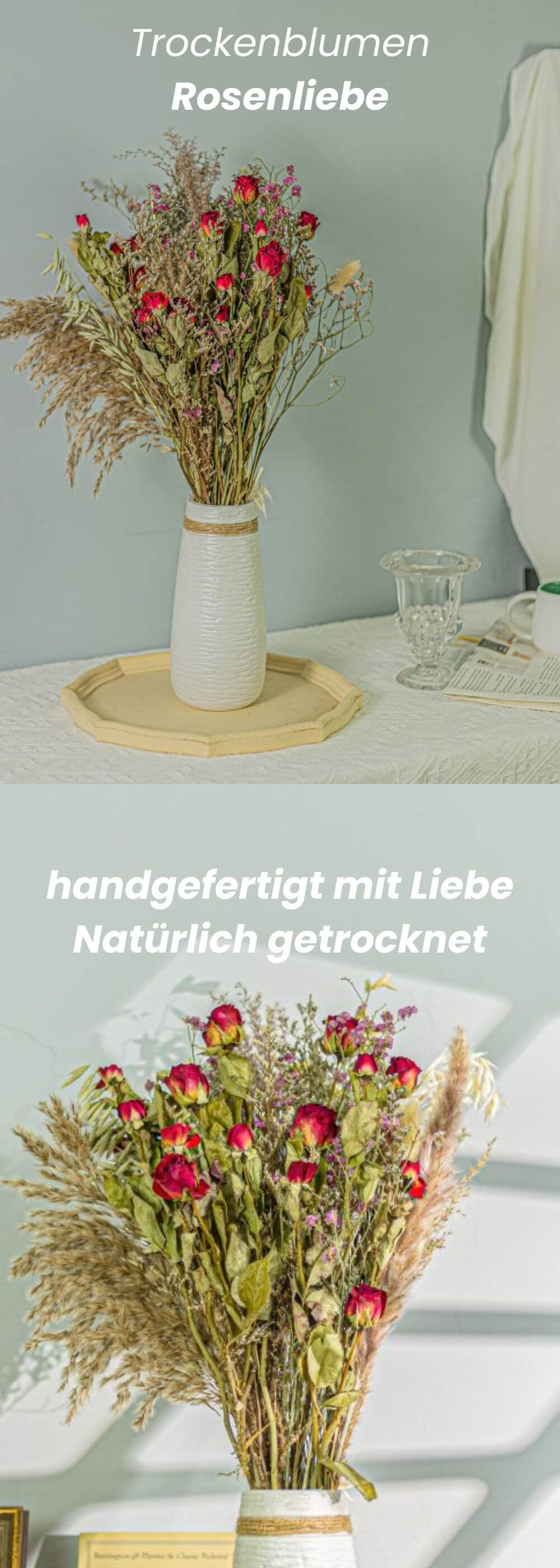 Lass dich von unseren Trockenblumen „Rosenliebe“ an die schönsten Momente der Liebe erinnern. Mit ihrer zarten roten Farbe bringen sie eine warme, einladende Atmosphäre in dein Zuhause – so als wäre jeder Tag ein Fest der Zuneigung.